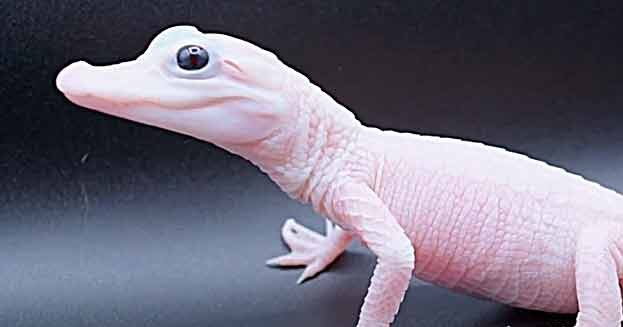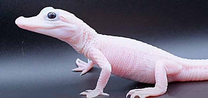Esses jacarés leucísticos, em geral, apresentam pele translúcida e olhos azuis, diferentemente dos crocodilos albinos, que possuem olhos vermelhos ou rosados.