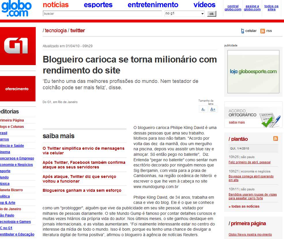 Estou feliz em compartilhar com vocês a excelente matéria do G1 que conta um pouco da trajetória de sucesso do Mundo Gump. Clique na imagem para ver maior